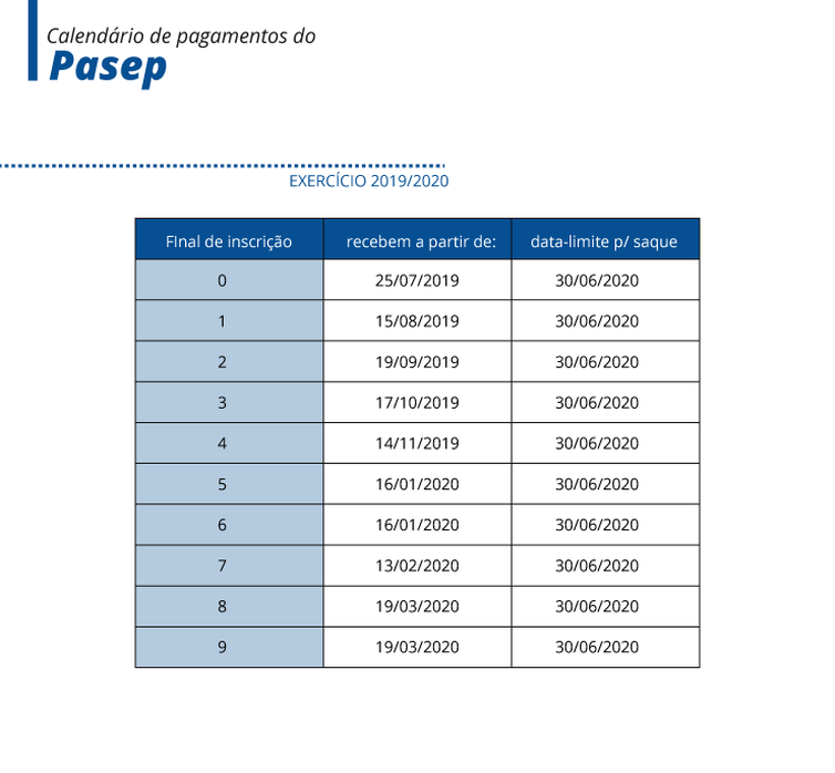 Os servidores públicos com o digito final de inscrição do Pasep de 0 e 4 também recebem este ano. Já no caso das inscrições com o final entre 5 e 9, o pagamento será no próximo ano. O fechamento do calendário de pagamento do exercício 2019/2020 será no dia 30 de junho de 2020.