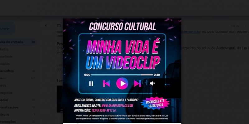 Mais informações podem ser solicitadas pelo email minhavidaeumvideoclip@gmail.com ou pelo contato (63) 99206-3617, bem como o regulamento no site www.grupoartpalco.com.br.