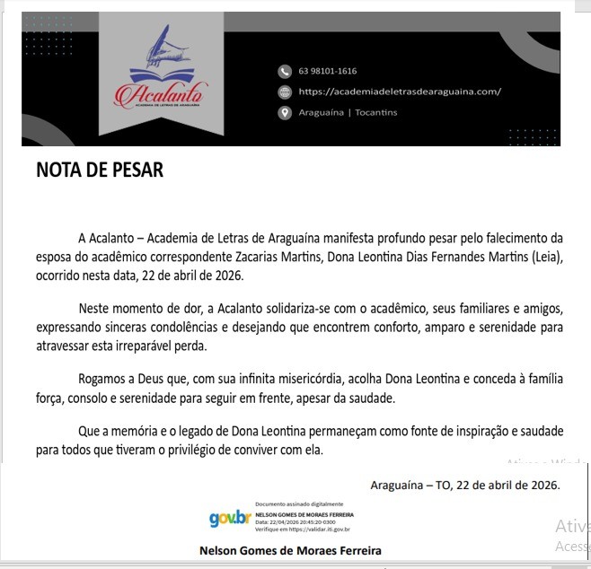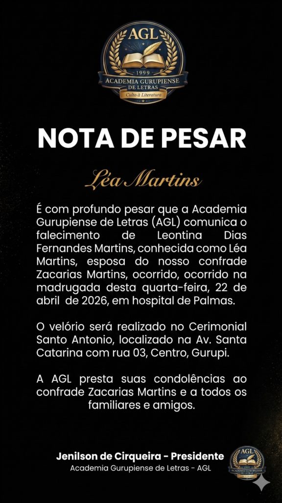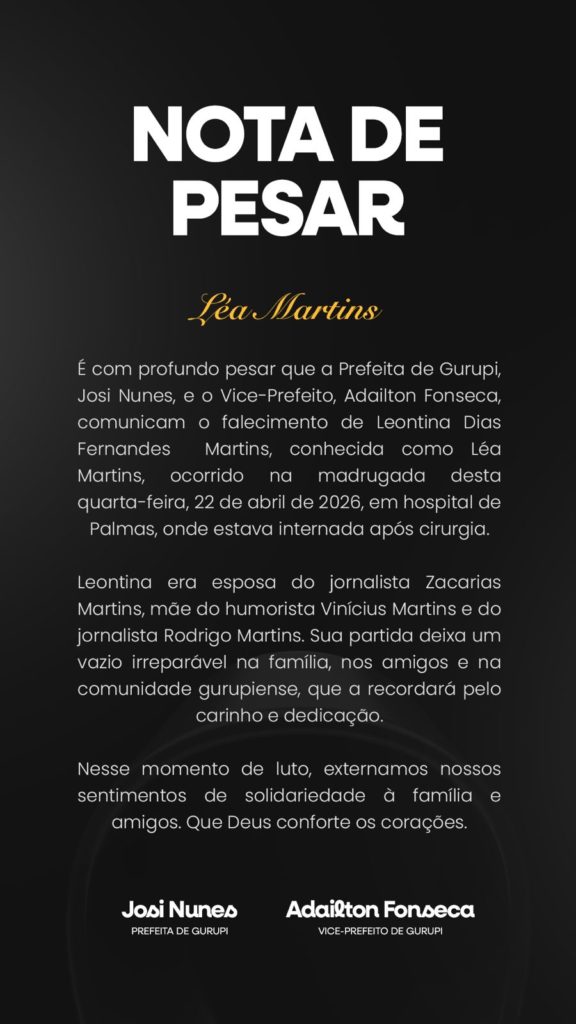 A manhã desta quarta-feira, 22 de abril de 2026, amanheceu mais silenciosa em Gurupi. A notícia do falecimento de Leontina Dias Fernandes Martins, a querida Dona Lea, trouxe uma onda de consternação à cidade. Mais do que a partida de uma moradora, a comunidade lamenta o silêncio de uma voz que sempre soube acolher, cuidar e fortalecer os laços entre aqueles que a cercavam.